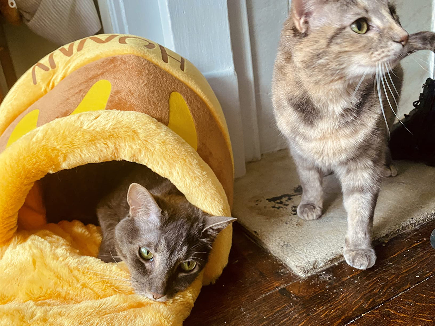 This got here two days ago, and after sprinkling some catnip to entice my 8-year-old babies, they darted straight into it! I never see it without one of the two cats napping in it now. They’ve started fighting over which one gets it now