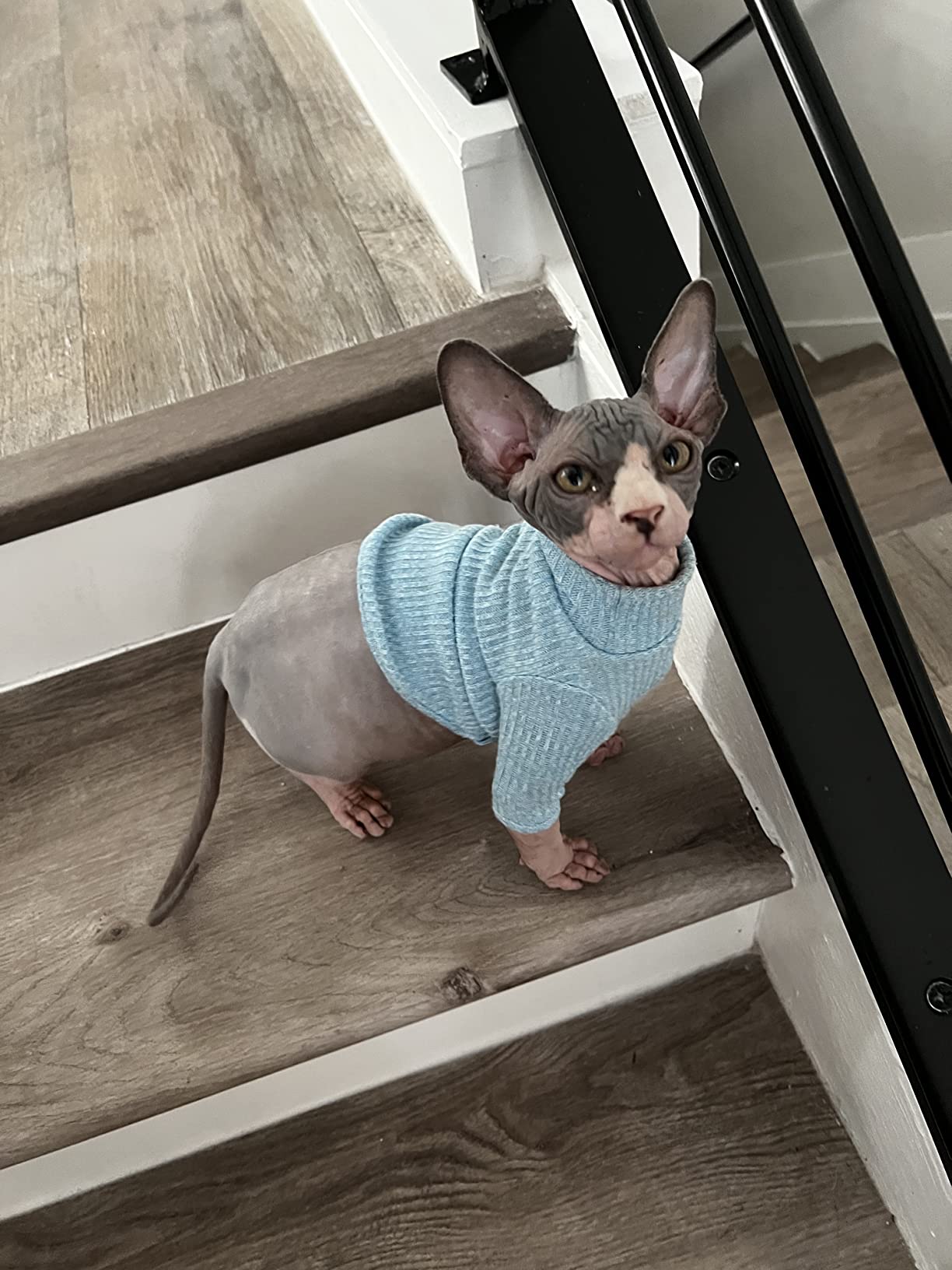 For reference my kitty is 4 months old and around 4lbs, I ordered an xs. I should have gotten one size up as he will probably grow out of it extremely fast but I was not thinking straight! Anyways I would order one size up if your little one is still growing. The sweater is very lightweight, perfect for us here in Florida :)